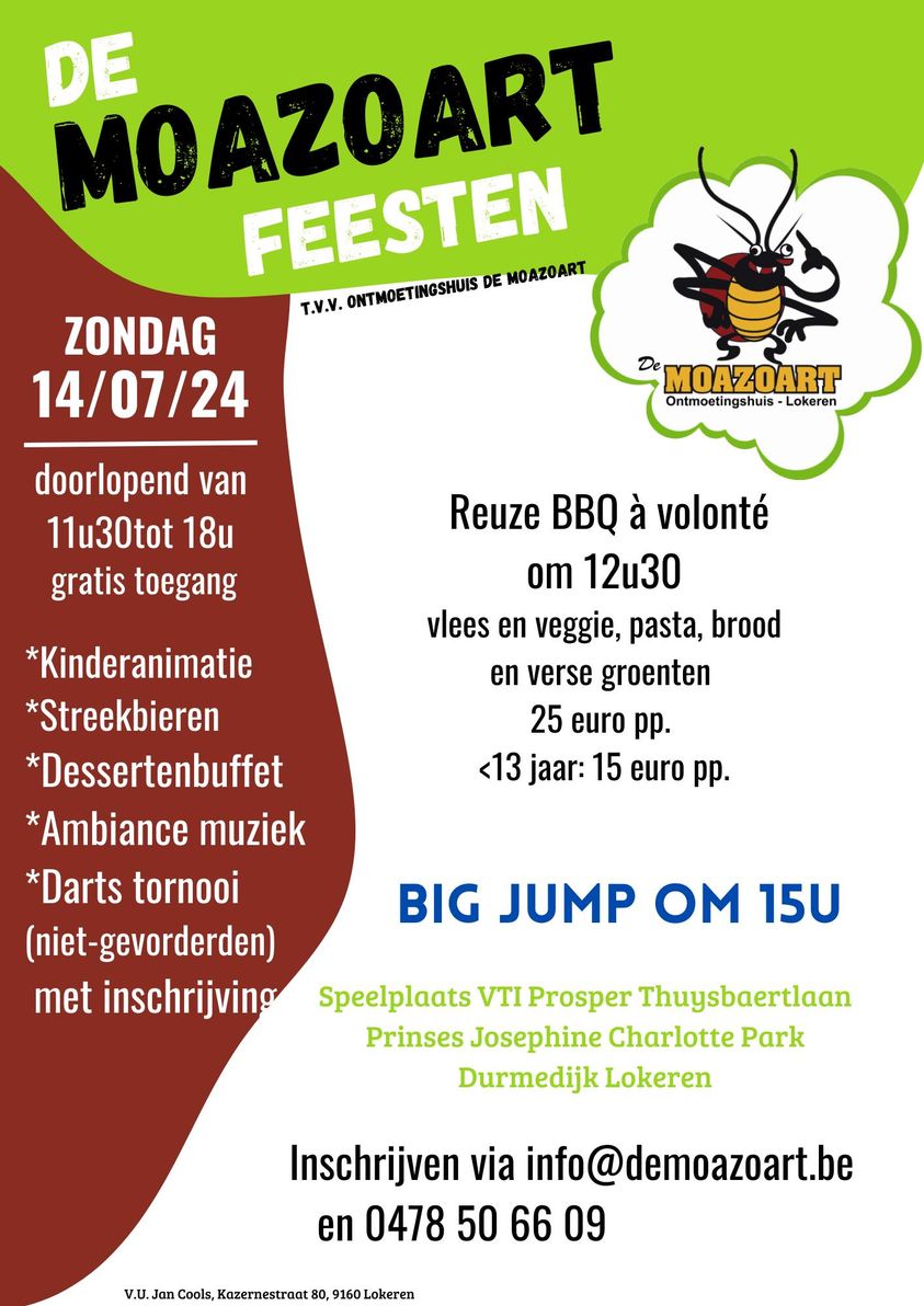 11.30 doorlopend Moazoartfeesten met reuze BBQ (veggie of vlees), kinderanimatie, streekbieren, dessertenbuffet, ambiance muziek, en Darts tornooi (niet-gevorderden)