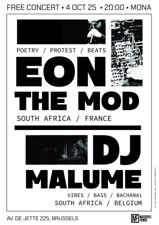 Gratis concert van spoken word artistenduo Eon The Mod (Zuid-Afrika) & DJ Malume (Zuid-Afrika) in de tijdelijke invulling Mona, een voormalig klooster in het centrum van Jette.