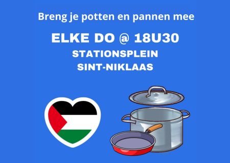 Niet alleen rechtstreeks geweld, maar ook hongersnood worden door Israël als wapen ingezet in de genocide van de Palestijnen. Zoals vele acties met potten en pannen in andere steden, doet Sint-Niklaas ook mee.Deze actie wordt georganiseerd door ABVV, ACV, Hart Boven Hard Waasland, Intal, Masereelfonds Sint-Niklaas, Pax Christi, Sint-Niklaas zonder Racisme, Solidagro, VLOS, VREDE vzw.