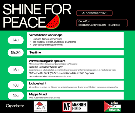 Op zaterdag 29 november nodigen we je van harte uit voor Shine For Peace, een dag vol ontmoeting, inspiratie en solidariteit in de Oude Post in Halle. Samen willen we het licht laten schijnen voor vrede en rechtvaardigheid in Palestina.