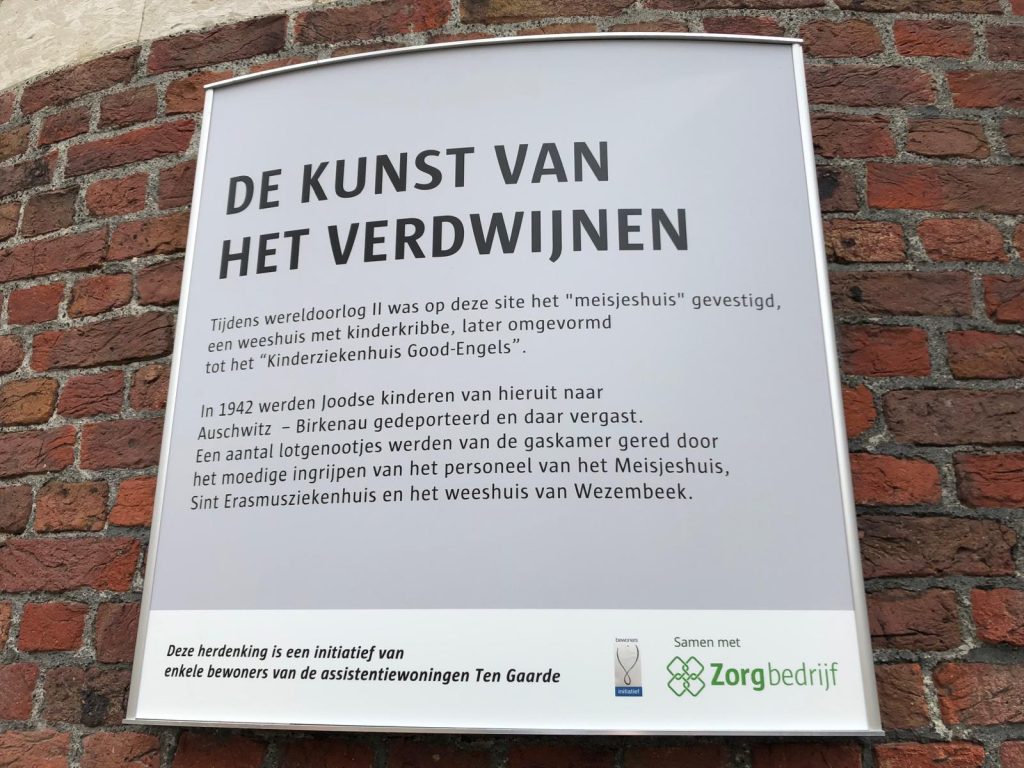 Met de tweede insteek wilden we ons respect tonen voor het toenmalige zorgpersoneel. Zij brachten de kinderen weg uit het toenmalige meisjeshuis om hen veilig te stellen voor deportatie door de nazi’s. Indachtig de misdaden en de terreur van de nazi’s, beseften we maar al te goed dat zij een verzetsdaad pleegden en dat verdient alle respect. Ze dachten niet aan zichzelf, maar aan de kinderen die gered moesten worden. Dat is gelukt dankzij de hulp van de nonnen en het verplegend personeel van het St. Erasmusziekenhuis en uiteindelijk ook van de mensen van het Joods weeshuis van Wezenbeek.