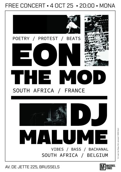 Gaza Klimaat muziek protest Slam poetry 04 okt 2025 Free Concert Eon The Mod & DJ Malume activisme klimaat poezie wereldse muziek Brussel